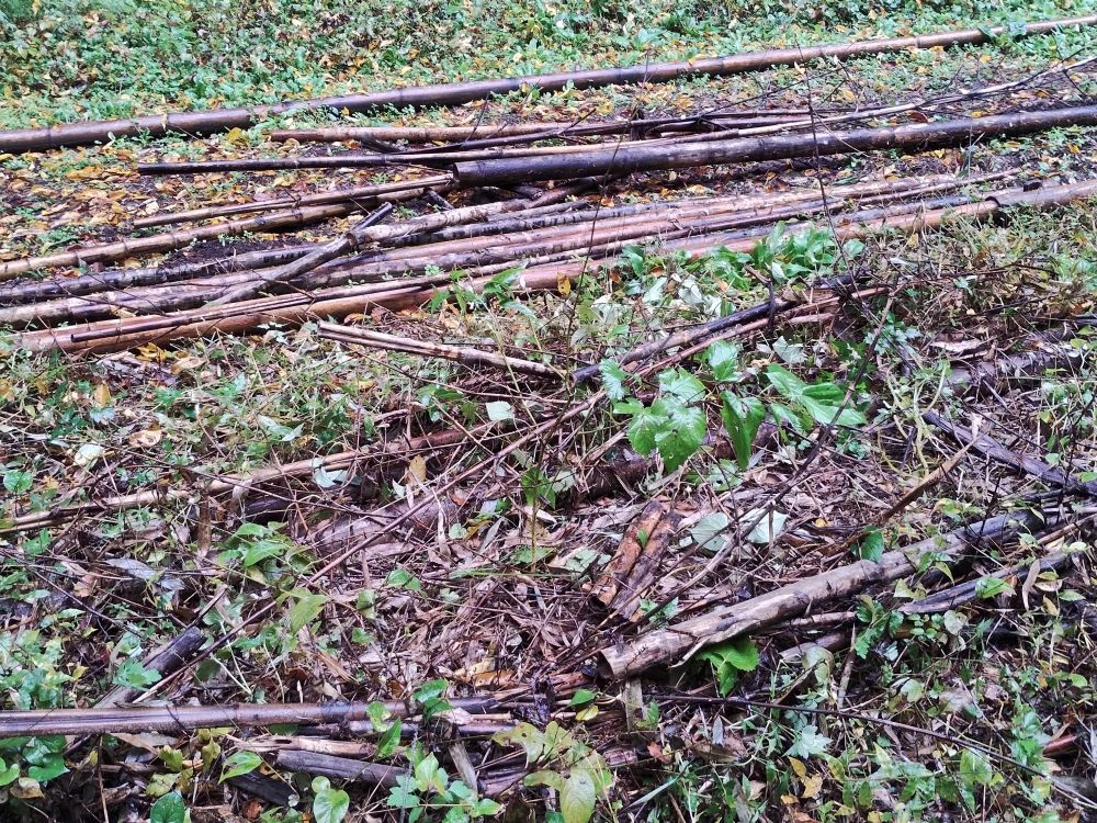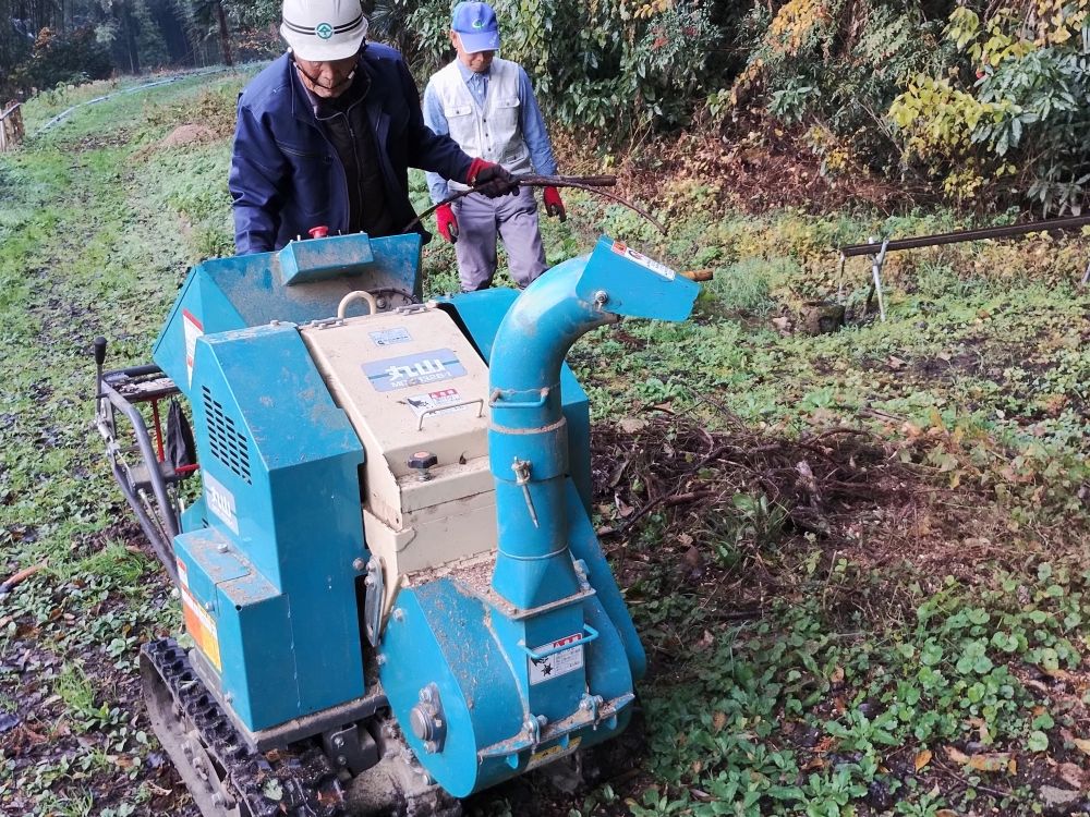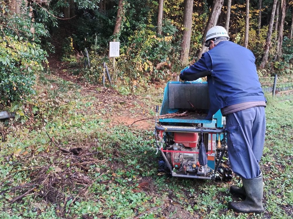 ・平日活動日(11月26日) 2025年11月26日 最終更新日時 : 2025年12月29日 wordpress_blog 11月26日(水)9時より平日活動日に7名の会員が集まり、活動エリア内に点在する倒木の処理された枝などの粉砕作業を行いました。今年の夏ごろに台風などによってあぜ道などを塞いでいた倒木を切断したままにしていましたが、葉っぱの付いた枝部分を粉砕処理機により細かく砕いたものを竹林内に散布しました。年々老木の数が増え続けることで今後もこの作業を続けることが必要となりますが、中には大木も多く存在することから大掛かりな対策を行う必要が求められます。